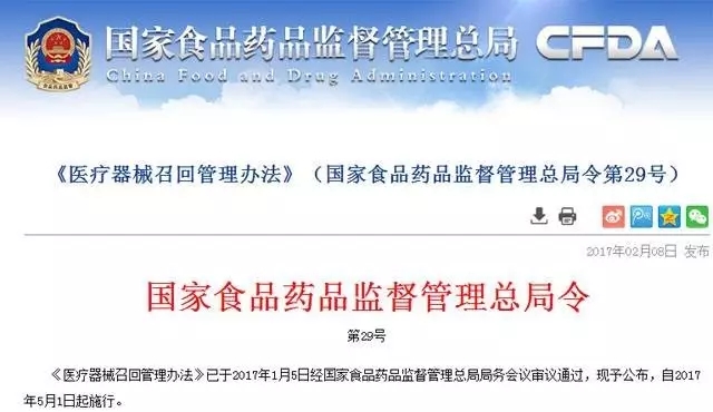 為強(qiáng)化醫(yī)療器械召回的監(jiān)督管理,切實(shí)推動(dòng)企業(yè)召回主體責(zé)任的落實(shí),根據(jù)《醫(yī)療器械監(jiān)督管理?xiàng)l例》,國(guó)家食品藥品監(jiān)管總局制定頒布了《醫(yī)療器械召回管理辦法》(以下簡(jiǎn)稱《辦法》)。該《辦法》于2017年5月1日正式施行。