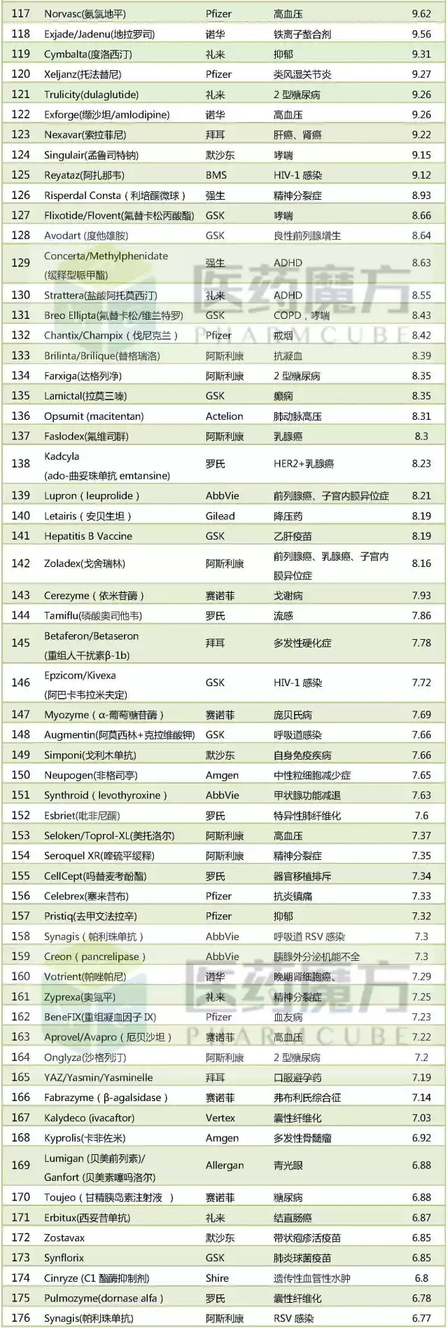 2016年全球藥品銷售額TOP200(單位:億美元)