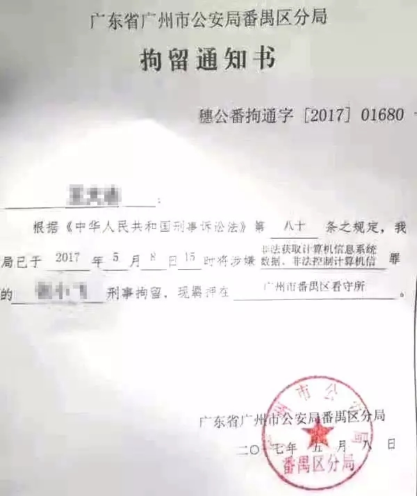 5月9日,財新記者獲得若干份《拘留通知書》照片,顯示黑客們涉嫌罪名多為“非法獲取計算機信息系統(tǒng)數據”、“非法控制計算機信息”等。這些《拘留通知書》的落款均為廣州市公安局番禺區(qū)分局,時間均為5月8日。