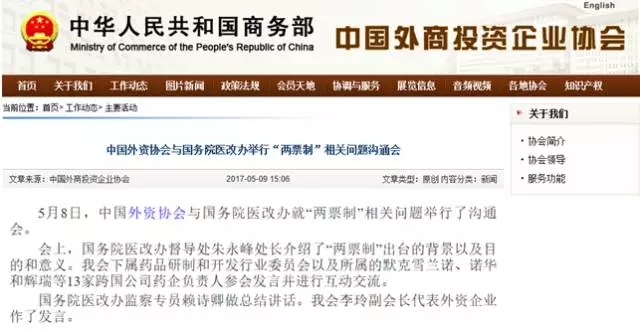 據(jù)中國外商投資企業(yè)協(xié)會網(wǎng)站消息,5月8日,中國外資協(xié)會與國務(wù)院醫(yī)改辦就“兩票制”相關(guān)問題舉行了溝通會。