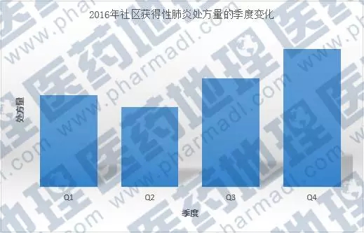 社區(qū)獲得性肺炎的發(fā)病與季節(jié)密切相關(guān),第四季度的處方量最大,第二季度的處方量最小。第四季度的處方量與第二季度相比增長(zhǎng)高達(dá)72%。