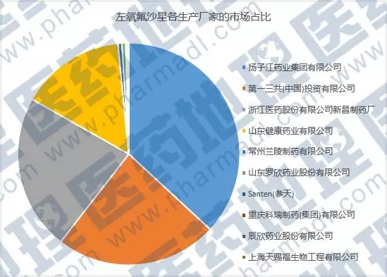 揚(yáng)子江的“左克”占據(jù)了左氧氟沙星市場(chǎng)37%的市場(chǎng)份額,第一三共和浙江醫(yī)藥的市場(chǎng)份額非常接近,三家合計(jì)占據(jù)了將近九成的市場(chǎng)。