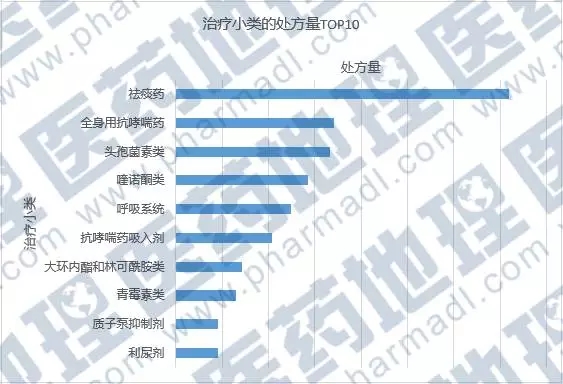 我們統(tǒng)計(jì)了一下呼吸內(nèi)科病房所開(kāi)藥物的治療小類(lèi),多達(dá)52種。處方量居前十的治療小類(lèi)如下圖所示,祛痰藥處方量遙遙領(lǐng)先,整個(gè)抗感染藥物的處方量之和才勉強(qiáng)超過(guò)祛痰藥。在處方表內(nèi),我們還發(fā)現(xiàn)了康艾注射劑、谷胱甘肽、輔酶Q10、小牛脾提取物。隨著臨床路徑管理的不斷深入,這些藥物的市場(chǎng)將面臨萎縮。在抗感染藥物中,頭孢菌素類(lèi)占比最大,頭孢菌素、喹諾酮類(lèi)以及大環(huán)內(nèi)酯類(lèi)抗生素是臨床指南中的主力推薦用藥。其中左氧氟沙星的處方量最大。