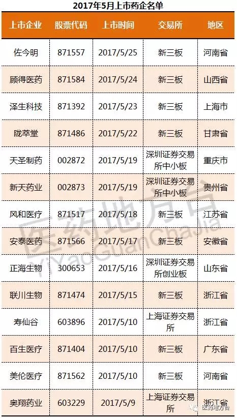 醫(yī)藥地方臺根據(jù)相關(guān)資料統(tǒng)計(jì),2017年5月份,共有14家醫(yī)藥企業(yè)上市。其中,天圣制藥、新天藥業(yè)在深圳證券交易所中小板上市;正海生物在深圳證券交易所創(chuàng)業(yè)板上市;壽仙谷、奧翔藥業(yè)在上海證券交易所上市,其余9家企業(yè)在新三板上市。