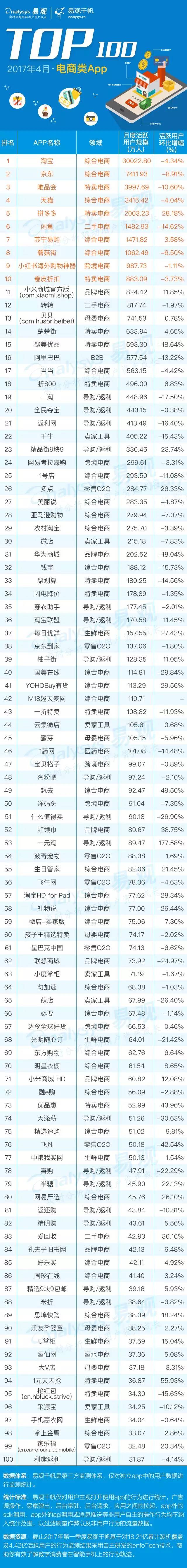 6月7日,易觀發(fā)布2017年電商最新APP前100強(qiáng)榜單,榜單涉及綜合電商、特賣電商、跨境電商、生鮮電商、母嬰電商、醫(yī)藥電商以及新興的汽車交易等7大領(lǐng)域,基于易觀千帆4月移動(dòng)應(yīng)用大數(shù)據(jù)篩選而成。