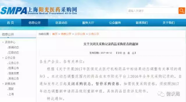 6月12日,上海陽光醫(yī)藥采購網(wǎng)印發(fā)《關(guān)于關(guān)閉無采購記錄藥品采購狀態(tài)的通知》指出,動態(tài)調(diào)整范圍內(nèi)的藥品在本市陽光平臺上2016年全年無采購記錄的藥品,自通知發(fā)布之日起關(guān)閉采購狀態(tài),暫停采購資格。
