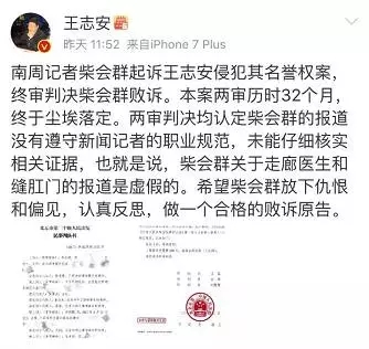 6月15日,王志安在其微博上曬出了北京市第二中級人民法院的民事判決書,并在微博中表示:本案兩審歷時32個月,終于塵埃落定。兩審判決均認(rèn)定柴會群的報道沒有遵守新聞記者的職業(yè)規(guī)范,未能仔細(xì)核實相關(guān)證據(jù),也就是說,柴會群關(guān)于走廊醫(yī)生和縫肛門的報道是虛假的。希望柴會群放下仇恨和偏見,認(rèn)真反思,做一個合格的敗訴原告。
