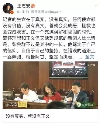 隨著北京市第二中級人民法院駁回柴會群的上訴請求,此案也正式宣布塵埃落定。6月16日上午,王志安發(fā)布了長微博《沒有真實,就沒有正義》,梳理了這起案件的前因后果,并表示自己不會反訴柴會群。而且“看著桌子上厚厚一疊判決書,并沒有多少欣喜,對柴會群也沒有任何仇恨,這是一個充滿誤解和隔閡的時代,滿懷理想和正義,但又缺乏規(guī)范的新聞人比比皆是,柴會群不過是其中的一位……希望這起漫長的訴訟,能讓他最終猛醒。”