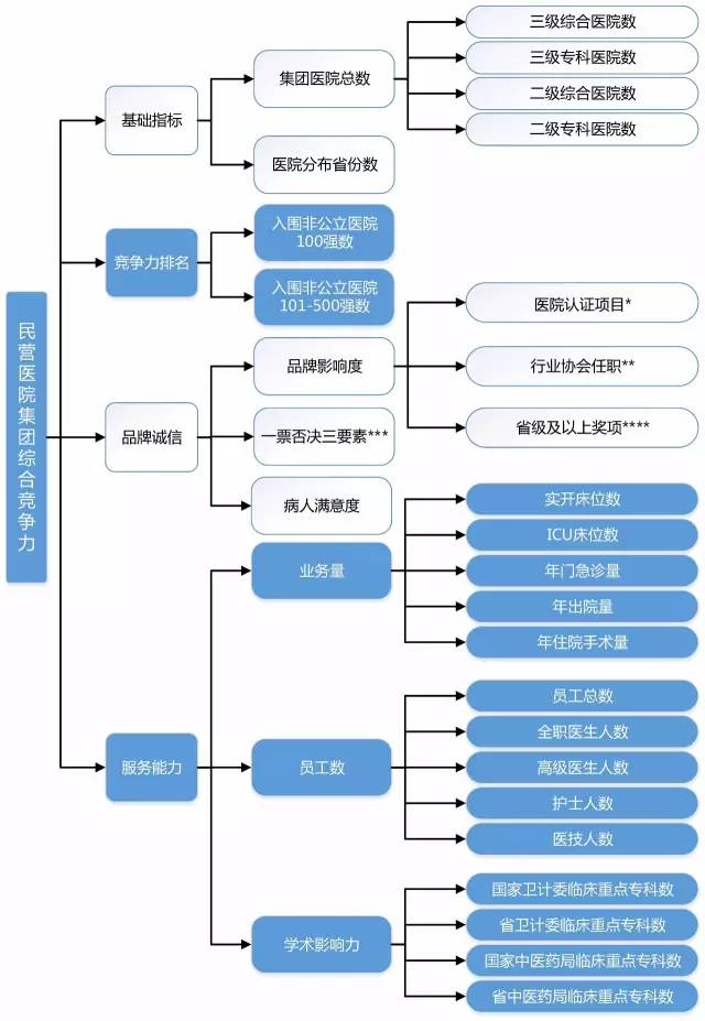 四、服務(wù)能力:是體現(xiàn)集團(tuán)規(guī)模和質(zhì)量的重要指標(biāo),包括業(yè)務(wù)量、員工數(shù)和學(xué)術(shù)影響力。其中業(yè)務(wù)量包括實(shí)開床位數(shù)、ICU床位數(shù)、年門急診量、年出院量和年住院手術(shù)量;員工數(shù)體現(xiàn)規(guī)模和人才結(jié)構(gòu),包括員工總數(shù)、全職醫(yī)生人數(shù)、高級(jí)醫(yī)生人數(shù)、護(hù)士和醫(yī)技人數(shù);學(xué)術(shù)影響力選取國(guó)家衛(wèi)計(jì)委和中醫(yī)藥局、省衛(wèi)計(jì)委和中醫(yī)藥局的臨床重點(diǎn)??谱鳛橹笜?biāo)。
