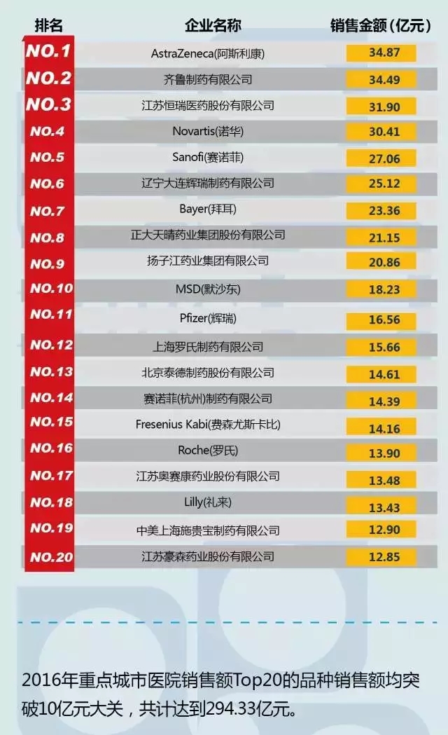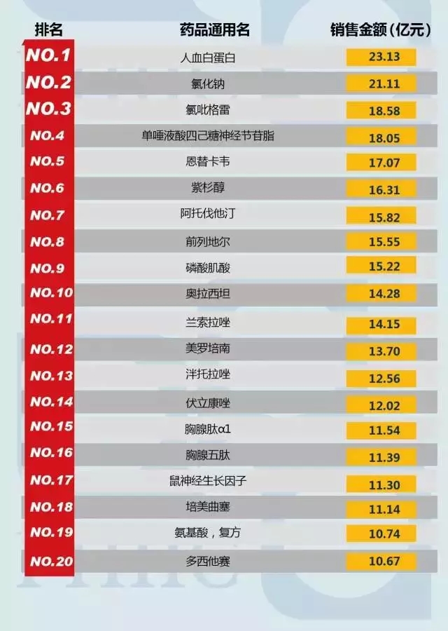 2016中國醫(yī)院藥品銷售前20排名