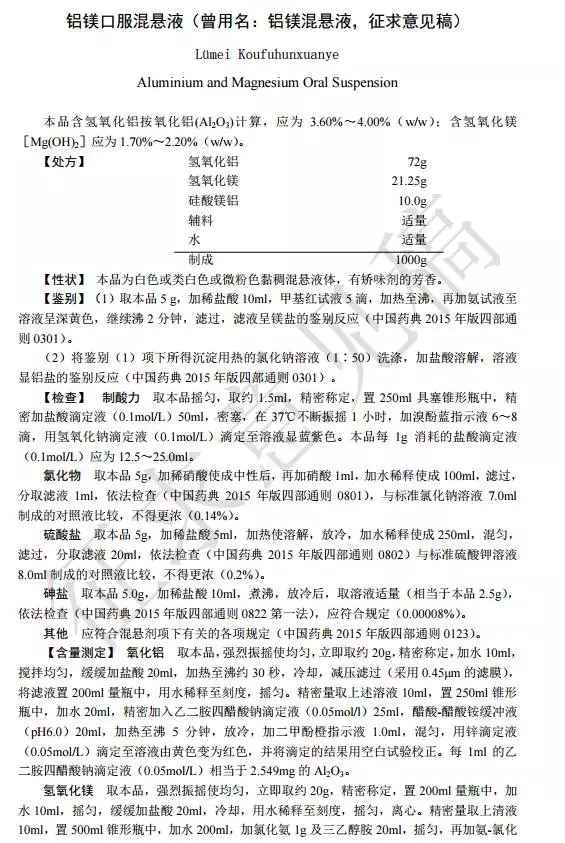 關(guān)于鋁鎂口服混懸液(曾用名:鋁鎂混懸液)標(biāo)準(zhǔn)的公示
