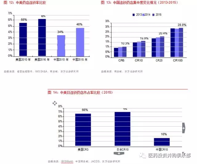 中國(guó)藥店連鎖率較低、集中度低,相比美日仍有較大提升空間。2015 年,我國(guó)零售藥店數(shù)目為 44.8萬(wàn)家,其中單體藥店 24.3 萬(wàn)家,連鎖藥店 20.5 萬(wàn)家,連鎖率僅 45.7%。雖然新版 GSP 推行以來(lái),我國(guó)藥店連鎖率快速提升,但距離商務(wù)部《全國(guó)藥品流通行業(yè)發(fā)展規(guī)劃綱要(2015-2020)》提出的:“到 2020 年連鎖藥店占全部零售門(mén)店的比重提高到 50%以上”的規(guī)劃,仍有一定的空間,和美國(guó)藥店 62%連鎖率(門(mén)店數(shù)連鎖率,銷(xiāo)售連鎖率已近 80%)相比也有較大差距。從集中度上看,中國(guó)百?gòu)?qiáng)連鎖藥店企業(yè)銷(xiāo)售額僅占當(dāng)年我國(guó)藥店市場(chǎng)銷(xiāo)售總額的 28.8%(CR100);CR10 則為15.9%,整體集中度仍然較低。而美國(guó)前三大連鎖藥房即占據(jù)藥房銷(xiāo)售總額 66%,占連鎖藥店更是超過(guò) 90%,日本藥店前 10 強(qiáng)市占率也達(dá)到 70%。由此來(lái)看,中國(guó)藥店市占率仍有較大的提升空間。