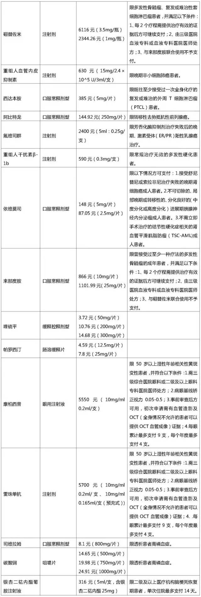 二、附表“醫(yī)保支付標(biāo)準(zhǔn)”一欄規(guī)定的支付標(biāo)準(zhǔn)包括基本醫(yī)療保險基金和參保人員共同支付的全部費用,基本醫(yī)療保險基金和參保人員的分擔(dān)比例由各統(tǒng)籌地區(qū)確定。規(guī)定的支付標(biāo)準(zhǔn)有效期截至2019年12月31日,有效期滿后按照醫(yī)保藥品支付標(biāo)準(zhǔn)有關(guān)規(guī)定進行調(diào)整。有效期內(nèi),如有同通用名稱藥品(仿制藥)上市,我部將根據(jù)仿制藥價格水平調(diào)整該藥品的醫(yī)保支付標(biāo)準(zhǔn)并另行發(fā)布;如出現(xiàn)藥品市場實際價格明顯低于現(xiàn)行支付標(biāo)準(zhǔn)的,我部可以與企業(yè)協(xié)商重新制定支付標(biāo)準(zhǔn)并另行發(fā)布。