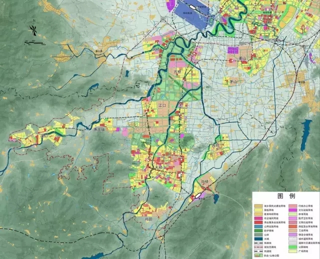 規(guī)劃布局遵循“精明增長”和“宜居家園”兩大發(fā)展理念。一是從粗放發(fā)展到精明增長,建設(shè)綠色生態(tài)示范區(qū),城市發(fā)展采取順應(yīng)山水格局的組團(tuán)式布局,組團(tuán)之間布置生態(tài)通風(fēng)廊道,避免連綿式發(fā)展,嚴(yán)格劃定生態(tài)紅線和城鎮(zhèn)開發(fā)邊界,將海綿城市、緊湊城市、TOD發(fā)展理念落實到規(guī)劃布局中。二是從增長機(jī)器到宜居家園,建設(shè)山水田園樂活城,采取山水入城、田園圍城、樂活營城的規(guī)劃理念,將山水引入城市,使城市與鄉(xiāng)村田園交融,營造樂活文化氛圍。