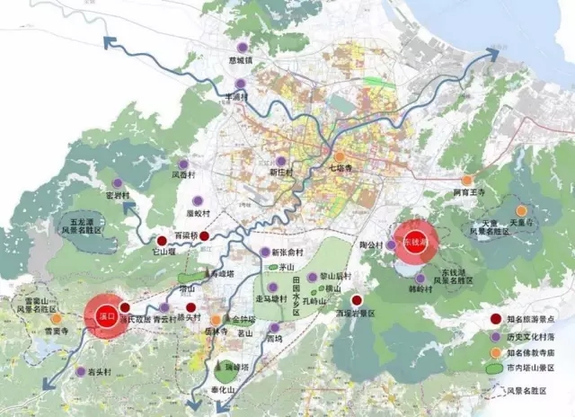兩翼六鎮(zhèn):兩翼即城市發(fā)展西側(cè)的山水旅游區(qū)和東側(cè)的水鄉(xiāng)田園區(qū)。西翼旅游休閑區(qū)包括溪口、蕭王廟2個特色小鎮(zhèn)和大片山水景觀區(qū);東翼水鄉(xiāng)田園區(qū)包括西塢、尚橋、尚田、茅山4個特色小鎮(zhèn)和大片水鄉(xiāng)田園景觀區(qū)。