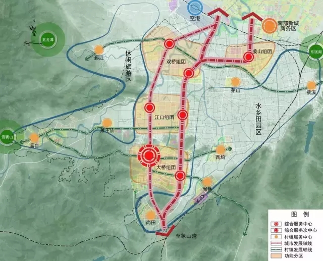 一帶四團(tuán):依托城市軌道和主干道路,由中心城區(qū)向南,串聯(lián)雙橋、姜山、江口、大橋四個精品城市組團(tuán),形成組團(tuán)式布局的城市發(fā)展帶。