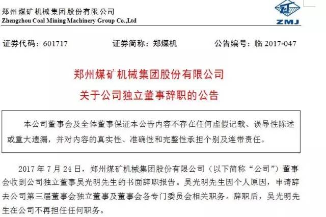 昨晚(7月24日),鄭州煤礦機(jī)械集團(tuán)股份有限公司(以下簡(jiǎn)稱鄭煤機(jī))公布了一則《關(guān)于公司獨(dú)立董事辭職的公告》,據(jù)公告顯示,董事會(huì)收到獨(dú)立非執(zhí)行董事吳光明的書面辭職報(bào)告,因個(gè)人原因辭任獨(dú)立非執(zhí)行董事、戰(zhàn)略委員會(huì)成員及薪酬與考核委員會(huì)主席的職務(wù),自公告之日起生效。