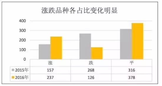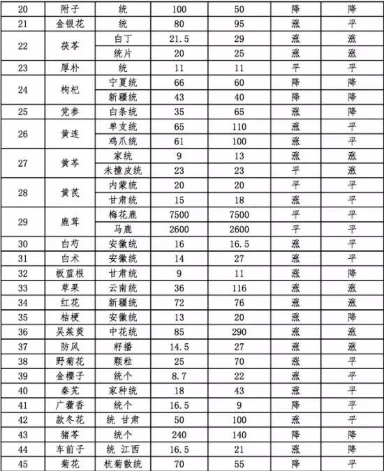 2016年,我國中藥材流通市場常見的741個中藥材流通 品種中,237個品種價格上漲,316個品種價格持平,268個品種價格下跌。與2015年相比,漲價品種和持平品種數(shù)量明顯增加,跌價品種數(shù)量大幅減少,品種行情總體向好。