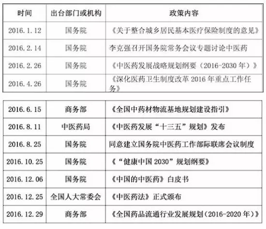 2016年,《“健康中國 2030”規(guī)劃綱要》提出要充分發(fā)揮中醫(yī)藥的獨特優(yōu)勢,提高中醫(yī)藥服務能力,發(fā)展中醫(yī)養(yǎng)生保健治未病服務,推進中醫(yī)藥繼承創(chuàng)新。《中醫(yī)藥法》首次從法律層面明確了中醫(yī)藥的重要地位,為保障和促進中醫(yī)藥事業(yè)發(fā)展提供了法律依據(jù)?!吨嗅t(yī)藥發(fā)展“十三五”規(guī)劃》 提出讓中醫(yī)藥產(chǎn)業(yè)成為我國國民經(jīng)濟重要支柱之一。這一系列利好政策的出臺,勾畫出中醫(yī)藥流通市場的光明前景,大大提升了市場信心。