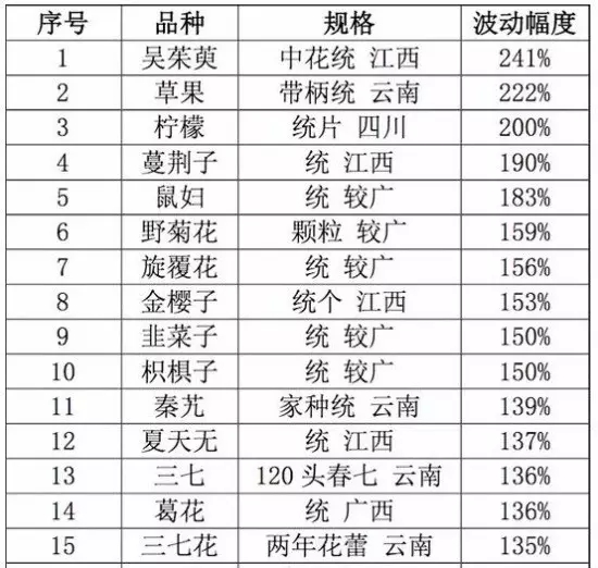 2016年價格漲幅排行前20品種 數(shù)據(jù)來源:中藥材天地網(wǎng)。
