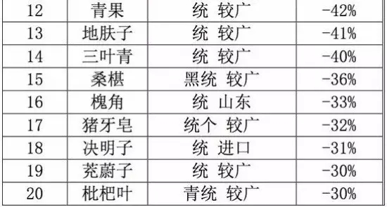 2016年價格跌幅排行前20品種 數(shù)據(jù)來源:中藥材天地網(wǎng)。