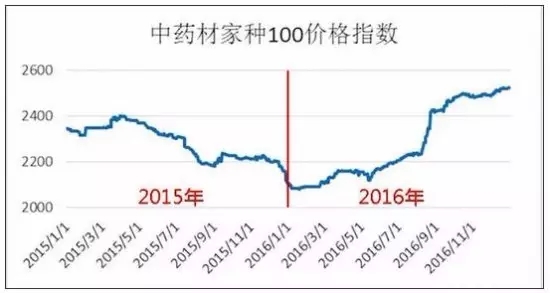反映家種中藥材價格運行情況的中藥材天地網(wǎng)“中藥材家種100價格指數(shù)”(我國具有代表性的100種家種中藥材市場價格的綜合加權(quán))在2016年整體上行,從2100點上行至2500點附近,逆轉(zhuǎn)了2015年的下行走勢。