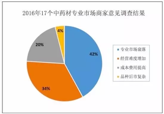 2016年,針對全國17個中藥材專業(yè)市場的調(diào)查顯示,42%的受訪商家表示傳統(tǒng)專業(yè)市場正在衰落,34%的受訪商家表示經(jīng)營難度比與過去明顯增加。