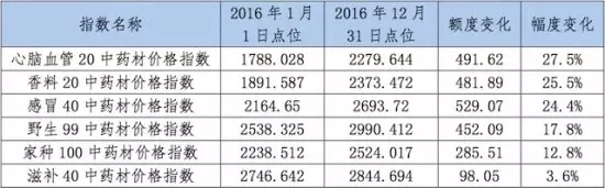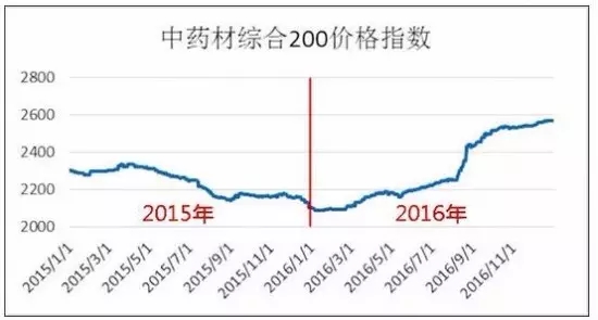 2016年,反映全國中藥材整體價格情況的中藥材天地網(wǎng)“中藥材綜合200價格指數(shù)”(我國200種主要大宗中藥材市場價格的綜合加權(quán))整體上行,從2100點左右上漲至2600點附近,與2015年走勢相比,價格明顯回暖。