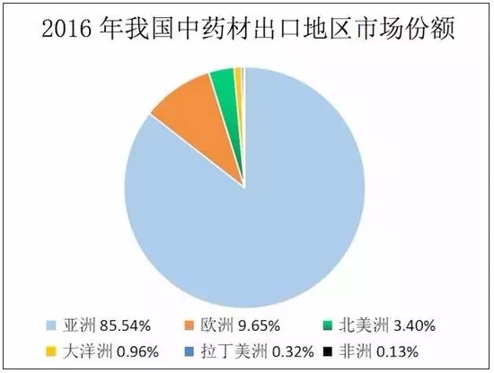 我國中藥材出口地區(qū)高度集中,亞洲依然是最主要的出口地區(qū)。2016年我國對亞洲地區(qū)的中藥材出口額約8.77億美元,占我國中藥材出口總額的85.54%。