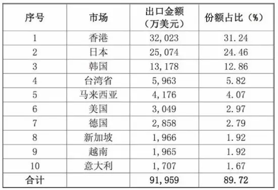 2016年,我國中藥材及飲片的10大出口地區(qū)為:中國香港、日本、韓國、中國臺灣、馬來西亞、美國、德國、新加坡、越南、意大利。我國對這10個市場的出口額占全球出口額的90%。這10個市場有7個分布在亞洲,多為傳統(tǒng)出口市場。