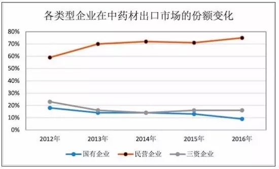 近年來,國有企業(yè)在中藥材及飲片出口市場中所占份額逐年下降,民營企業(yè)所占份額持續(xù)上升。2016年,民營企業(yè)市場份額為75%,同比上升4個百分點;國有企業(yè)市場份額跌落至9%,同比下降4個百分點;三資企業(yè)市場份額為16%, 與2015年基本持平。