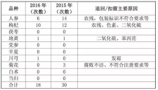 2016年,我國出口藥材整體質(zhì)量明顯提升。其中,2016年出口額排名前10的品種,因質(zhì)量等問題被日本、美國、 歐盟、韓國扣留或退回18次,比2015年的30次下降40%。