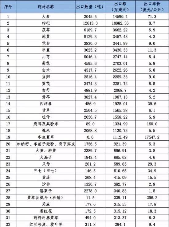 2016年,我國中藥材及飲片出口總額10.25億美元,同 比下降3.17%;以人民幣折算,出口總額67.69億人民幣,同比上漲2.97%;中藥材及飲片出口總量14.57萬噸,同比下降18.71%;中藥材及飲片平均出口單價46.43 元/公斤,同比上漲 26.71%。