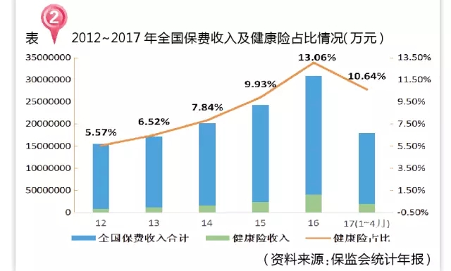 如此,被寄予眾望的健康險(xiǎn)業(yè)務(wù),并未獲得市場認(rèn)可,發(fā)展現(xiàn)狀不盡如人意,2012-2016年五年整個(gè)行業(yè)的健康險(xiǎn)保費(fèi)在總保費(fèi)(財(cái)產(chǎn)保險(xiǎn)、壽險(xiǎn)、意外險(xiǎn)、健康險(xiǎn))中平均占比僅為8.93%,即使是已開業(yè)的幾家專業(yè)健康險(xiǎn)公司也是經(jīng)營窘迫、舉步維艱。