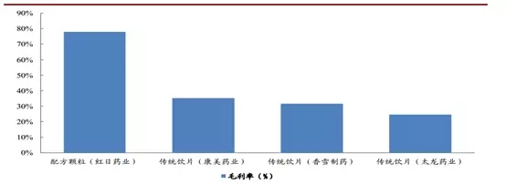相比中藥飲片,配方顆粒的盈利能力更強,且較中成藥生產(chǎn)周期更短。以紅日藥業(yè)為例,2015年公司配方顆粒業(yè)務(wù)毛利率78%左右,遠高于其他上市公司的中藥飲片25%-35%的毛利率水平。