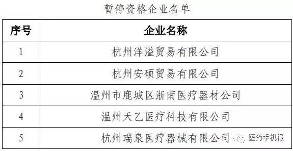 根據(jù)《國家衛(wèi)生計生委印發(fā)關(guān)于建立醫(yī)藥購銷領(lǐng)域商業(yè)賄賂不良記錄的規(guī)定的通知》、《浙江省衛(wèi)生和計劃生育委員會關(guān)于落實醫(yī)藥購銷領(lǐng)域商業(yè)賄賂不良記錄規(guī)定有關(guān)工作的通知》及《浙江省衛(wèi)生計生委關(guān)于將杭州洋溢貿(mào)易有限公司等五家企業(yè)及其有關(guān)責任人員列入我省醫(yī)藥購銷領(lǐng)域商業(yè)賄賂不良記錄的公告》的精神,經(jīng)研究決定,即日起暫停杭州洋溢貿(mào)易有限公司、杭州安碩貿(mào)易有限公司、溫州市鹿城區(qū)浙南醫(yī)療器材公司、溫州天乙醫(yī)療科技有限公司、杭州瑞泉醫(yī)療器械有限公司等5家企業(yè)在浙江省醫(yī)用耗材采購系統(tǒng)的在線交易配送資格。