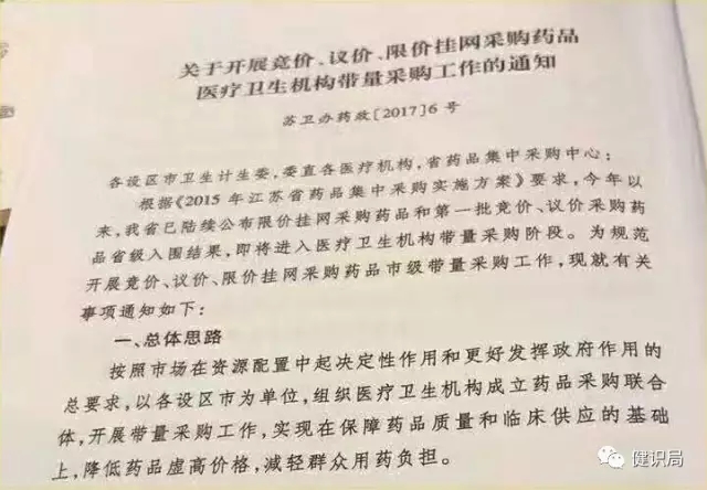 消息人士還給健識局傳來了江蘇省《關于開展競價、議價、限價掛網采購藥品醫(yī)療機構衛(wèi)生機構帶量采購工作的通知》(以下簡稱通知),通知下發(fā)日期為8月2日。