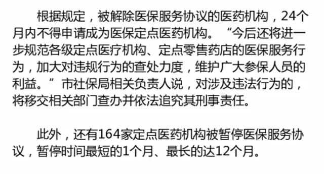 記者昨天從市社保局獲悉,寧波市實(shí)施醫(yī)保定點(diǎn)醫(yī)藥機(jī)構(gòu)協(xié)議管理以來,截至目前,全市共有175家醫(yī)保定點(diǎn)醫(yī)藥機(jī)構(gòu)因違規(guī)違約被解除(終止)或暫停醫(yī)保服務(wù)協(xié)議,其中被解除服務(wù)協(xié)議的定點(diǎn)零售藥店有9家,被終止服務(wù)協(xié)議的村衛(wèi)生室有2家。