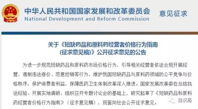 今天(8月14日),國家發(fā)展和改革委員公布了《短缺藥品和原料藥經(jīng)營者價格行為指南》(征求意見稿),社會各界人士可在2017年9月13日前,登陸發(fā)改委網(wǎng)站對《征求意見稿》提出意見建議。