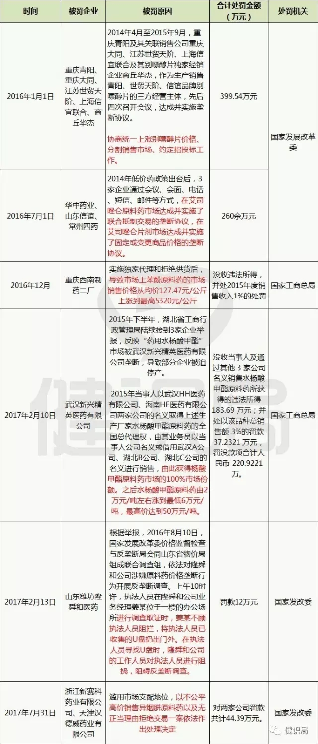 下面是2016年以來,6起短缺藥品和原料藥經(jīng)營者的價格壟斷行為被有關(guān)部門處罰的案例。