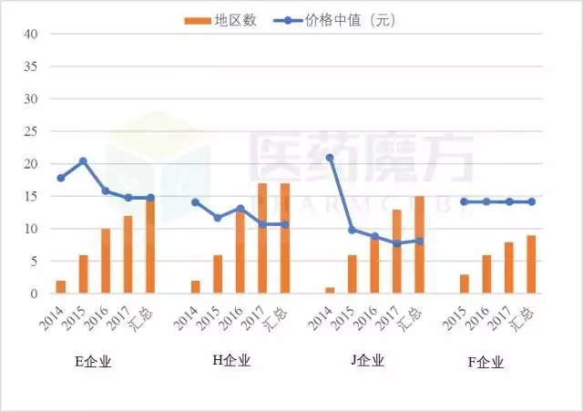 注:1)價(jià)格中值“匯總”:指該企業(yè)歷年所有省份中標(biāo)價(jià)格的中值;2)地區(qū)數(shù)“匯總”:指該企業(yè)歷年有中標(biāo)記錄的省份總數(shù)