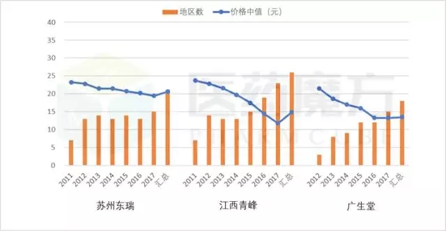 正大天晴(C企業(yè))和江西青峰在市場(chǎng)策略上,更多是傾向于降低產(chǎn)品價(jià)格,以最大程度地?fù)Q取中標(biāo)市場(chǎng),實(shí)現(xiàn)“以價(jià)換區(qū)域”。但是從數(shù)據(jù)來(lái)看,正大天晴無(wú)疑更成功一些,其產(chǎn)品最高降價(jià)幅度為38.8%,低于江西青峰50.2%的降幅,但其2017年中標(biāo)省份達(dá)27個(gè),高于江西青峰的23個(gè),反映其兼具全國(guó)性的市場(chǎng)開(kāi)拓能力和價(jià)格維護(hù)能力。