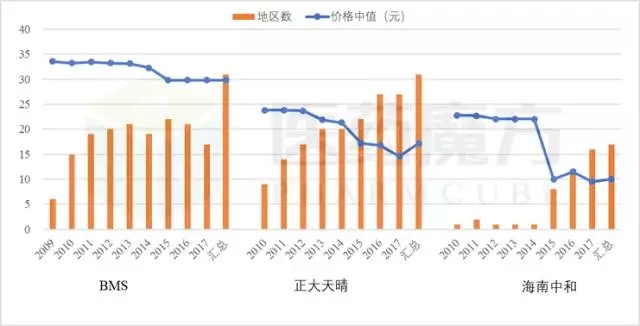 從下圖可以看出,BMS(A企業(yè))為維持產(chǎn)品的高價(jià)格,主動(dòng)放棄低價(jià)中標(biāo)市場(chǎng)(也有部分是未中標(biāo))。因此,曾經(jīng)陸續(xù)覆蓋過(guò)31個(gè)地區(qū)的BMS,2017年中標(biāo)省份僅為17個(gè)。更詳細(xì)的中標(biāo)情況可以進(jìn)入魔方中標(biāo)數(shù)據(jù)庫(kù) 查詢。