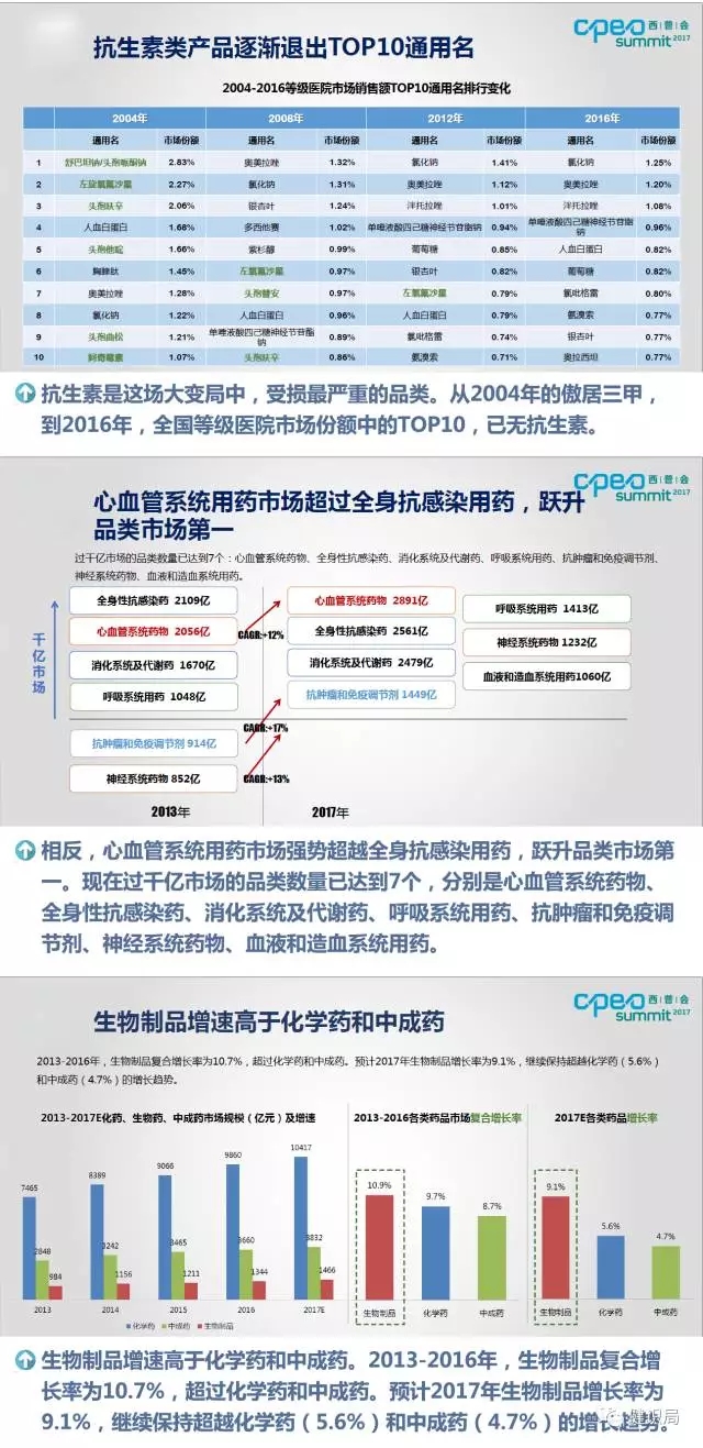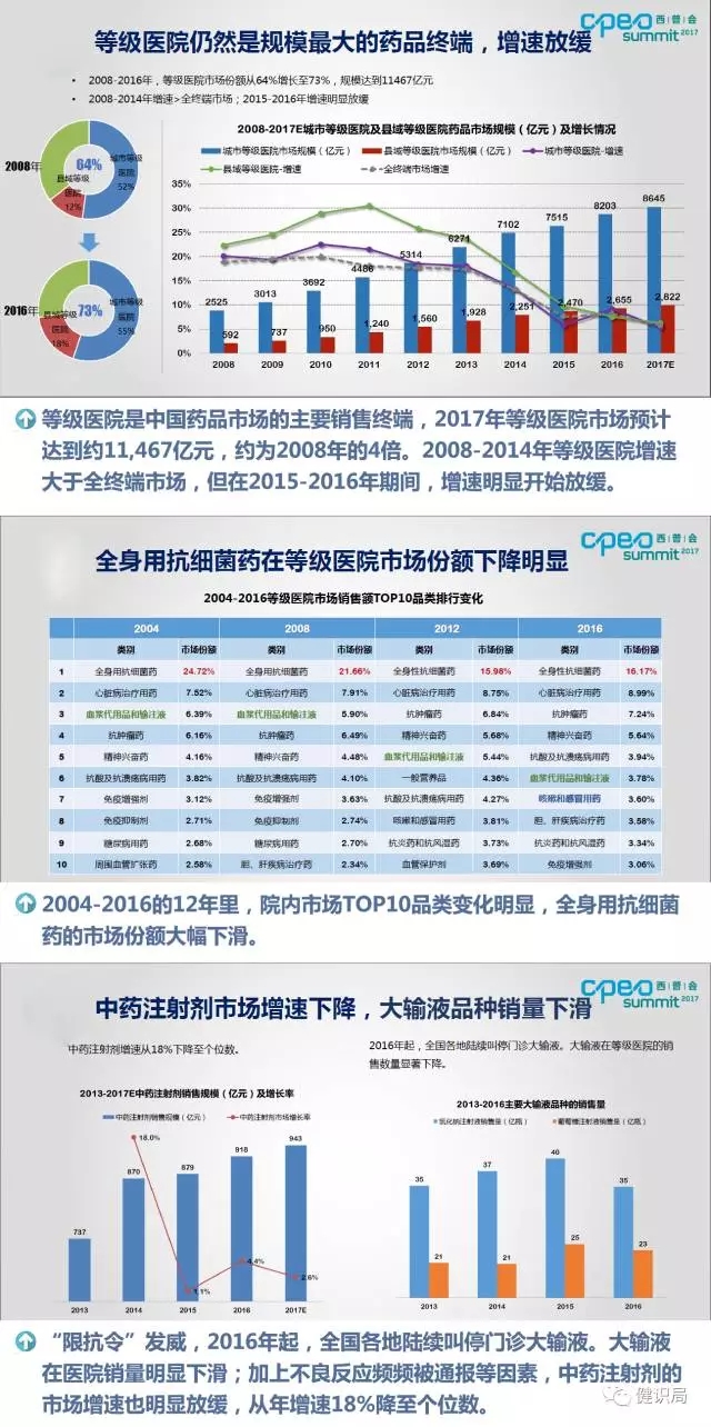 “2017年西普會(huì)”上發(fā)布的《六大終端市場結(jié)構(gòu)與轉(zhuǎn)移趨勢》顯示,2016年,中國藥品最主要銷售終端——等級(jí)醫(yī)院中,抗生素的市場份額,已經(jīng)退出top10;而迫于各地各級(jí)衛(wèi)生部門的“限抗令”,大輸液品種銷量明顯下滑,中藥注射劑市場增速下降。