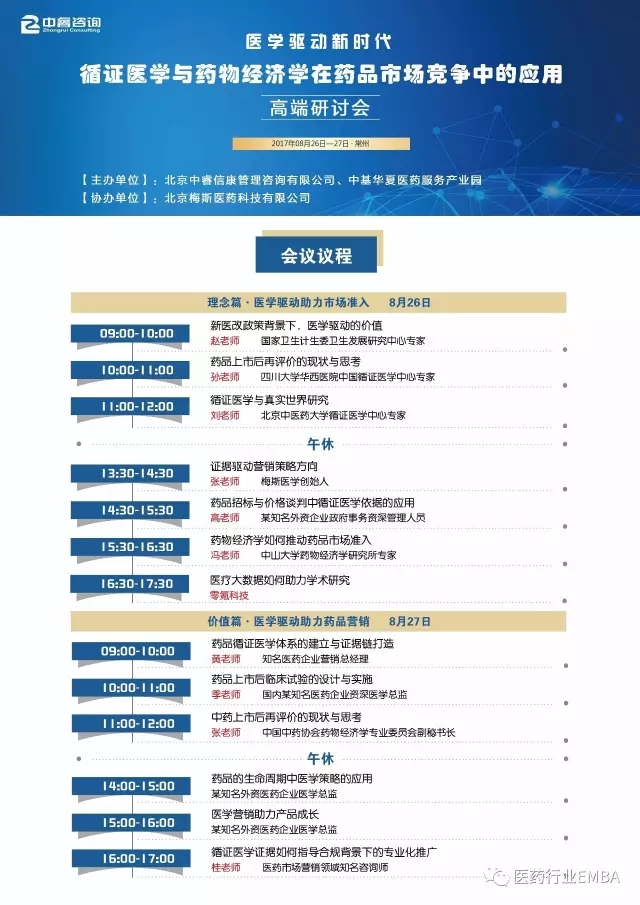 8月26日至27日,中睿咨詢將在常州再一次舉辦高端研討會,此次研討會的主題為“醫(yī)學(xué)驅(qū)動新時代——循證醫(yī)學(xué)與藥物經(jīng)濟(jì)學(xué)在藥品市場競爭中的應(yīng)用”。具體的研討會課題議程及邀請師資,見下圖: