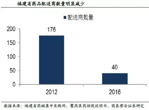 大型批發(fā)企業(yè)受“兩票制”影響有限甚至還會(huì)受益,而中小型批發(fā)企業(yè)承壓明顯,以過票為主的小企業(yè)將被淘汰,福建省配送商數(shù)量已由2012年8標(biāo)時(shí)的176家,減少到2016年的40家。