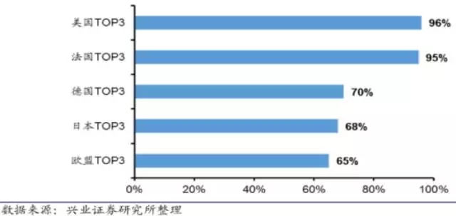 2015年各國醫(yī)藥流通行業(yè)前3企業(yè)市場份額合計(jì)占比