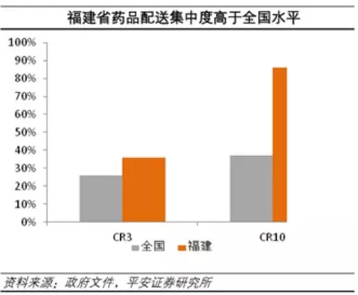 整個(gè)福建省,因最早實(shí)行兩票制,其醫(yī)藥批發(fā)企業(yè)的集中度遠(yuǎn)高于全國。