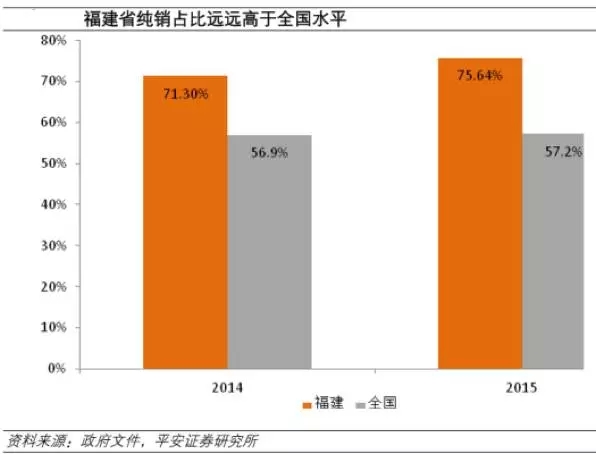 福建省的純銷比例由2014年的71.3%提升到2015年的75.64%,遠(yuǎn)高于同期全國的純銷占比57.2%,隨著“兩票制”在全國范圍的推廣,全國純銷占比也將會(huì)相應(yīng)上升。