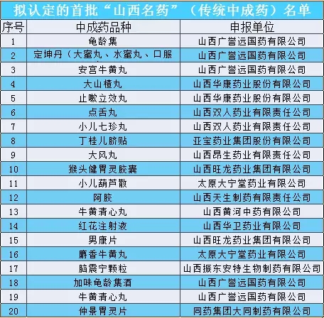 入選的20種中成藥分別為:山西廣譽(yù)遠(yuǎn)國藥有限公司的龜齡集、加味龜齡集酒、定坤丹、安宮牛黃丸、牛黃清心丸;山西華康藥業(yè)股份有限公司的大山楂丸、止嗽立效丸;山西雙人藥業(yè)有限責(zé)任公司的點(diǎn)舌丸、小兒七珍丸;亞寶藥業(yè)集團(tuán)股份有限公司的丁桂兒臍貼;山西昂生藥業(yè)有限責(zé)任公司的大風(fēng)丸;山西旺龍藥業(yè)集團(tuán)有限公司的猴頭健胃靈膠囊、男康片;太原大寧堂藥業(yè)有限公司的小兒葫蘆散、麝香牛黃丸;山西天生制藥有限責(zé)任公司的阿膠;山西黃河中藥有限公司的牛黃清心丸;山西華衛(wèi)藥業(yè)有限公司的紅花注射液;山西振東安特生物制藥有限公司的腦震寧顆粒;同藥集團(tuán)大同制藥有限公司的仲景胃靈片。